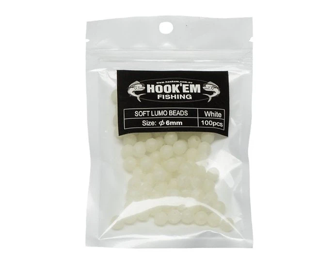 Hook’em Lumo Lime Soft Round beads are available in 4 size options. To get them too glow use a UV torch or hold them out in the sunlight and they will light up in the darker water below.
