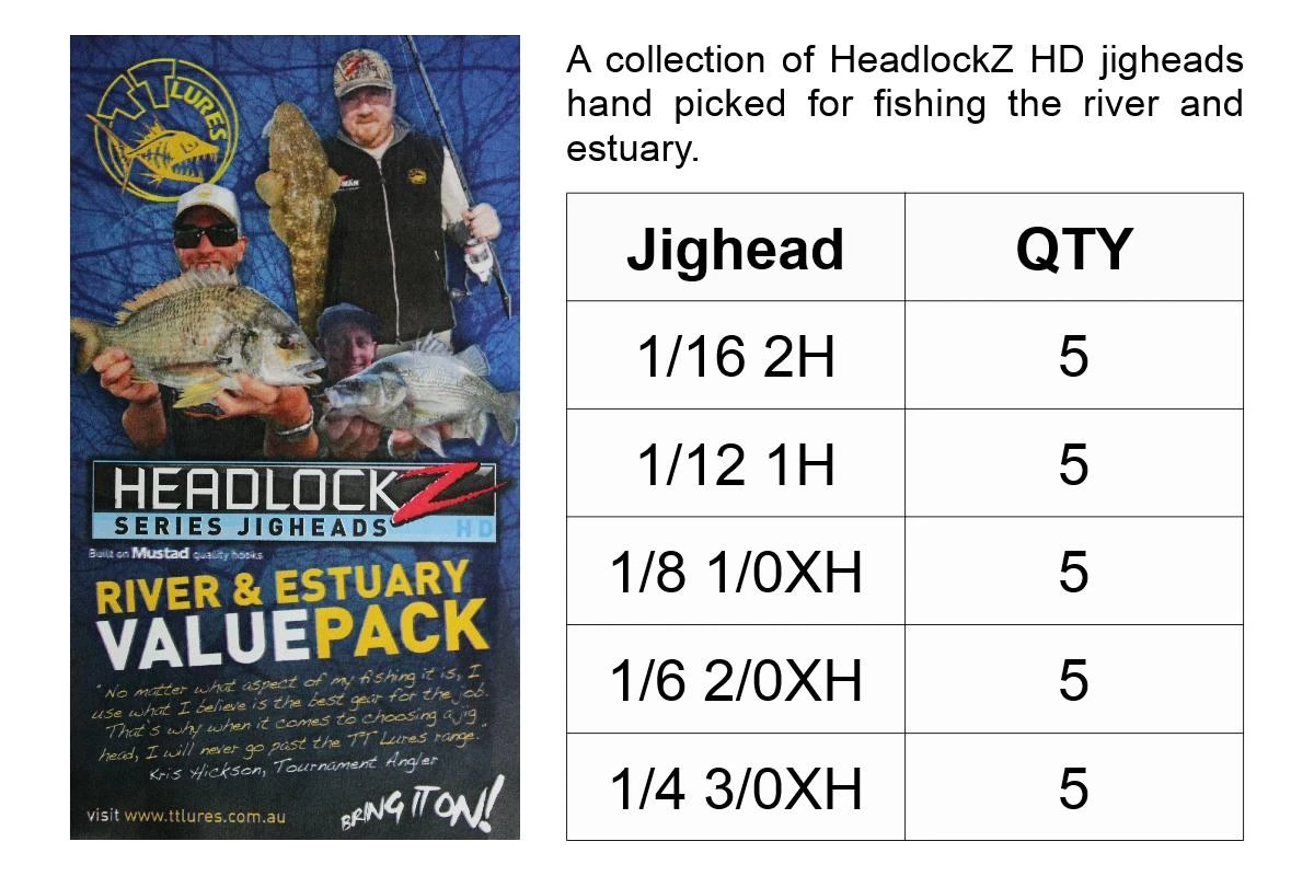 AFTA Award Winning. A selection of brutally strong TT Lures HeadlockZ HD jigheads to suit anglers fishing the rivers and estuaries for species such as bream, flathead and bass. Built on quality Mustad chemically sharpened hooks, this pack features five of each of the most popular estuary sizes, packed in a quality clear plastic tackle tray. Inside you will also find a guide to which plastics suit each jighead and the species you are likely to catch on that jighead / plastic combo.